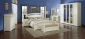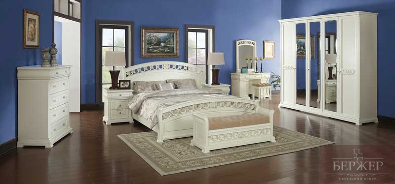Материалы: МДФ, эмаль. Размеры, мм: Пуф, 500×320×550. Стол туалетный с зеркалом, 1220×500×780, 880×110×1100. Кушетка, 1330×480×500. Кровать, 1600×2000, 1830×2180×1200. Кровать, 1800×2000, 2030×2180×1200. Тумба прикроватная, 550×440×650. Комод 5 ящиков, 930×500×1170. Тумба под ТВ, 830×560×620. Шкаф 3-дверный, 1530×650×2160. Шкаф 4-дверный, 2000×650×2150. Шкаф 5-дверный с зеркалом, 2450×650×2250.