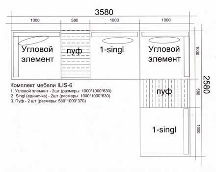 Габариты угла (2шт): Ширина: 1000мм Глубина: 1000мм Высота спинки: 630мм Высота сидения: 370мм