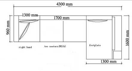 Габариты: Ширина: 4300мм Глубина: 960мм Глубина: 1600мм Высота спинки: 900мм Высота сидения: 330мм Вес: 170кг Объем: 3,2м3